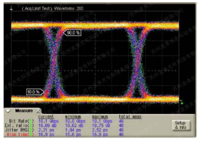 動態消光比的測量需要接(jiē)入射(shè)頻RF電信號在調(diào)製器的射頻端口,並(bìng)且DC偏(piān)壓設置在所做應用的合(hé)適工作點上(通(tōng)常Quad+,Quad-,Min,詳見調製器的偏(piān)壓控製文章)。所以,動態消(xiāo)光比是(shì)和最終應用相關的。例如數字調製方式(10Gb/s,通過MX-LN-10調製),如下(xià)圖,通過PRBS產生射頻電信號,偏(piān)壓控製在Quad點上,通過高速示波器,我們測量的眼(yǎn)圖最高和最低水平的比值-動態消光比是18.6dB(見示波器測量數(shù)值Ext. Ratio)。