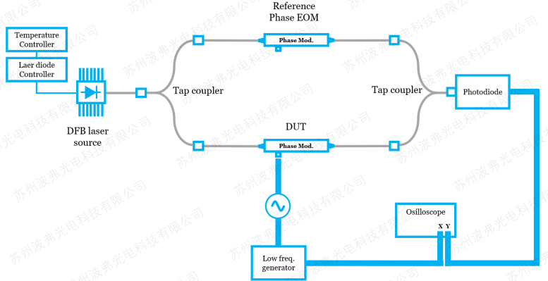對於相(xiàng)位調(diào)製器測量VπRF,必須將相位的變化轉變為強(qiáng)度的變化。這有很多方法:其一包(bāo)括45度入射相位調製器波導(偏振波導(dǎo)APE工藝不適用,通常iXblue 1um及其(qí)以(yǐ)下波長調(diào)製器為偏振波導),建議一個幹涉(shè)儀係統。其二可通過在一(yī)路光路中加入相位調製器,建議(yì)法布(bù)裏-珀羅幹涉(shè)儀。更多方法,請參考我們應用指南”相位調製器帶寬(kuān)測試”應用指南(nán)。
