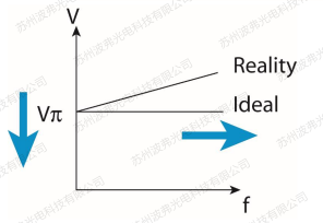 這是(shì)因為盡管與材料無關,但是設計和生產方麵(miàn),任何射頻電子(zǐ)零部件,隨著頻率的升高都會有射頻的衰(shuāi)減,其功(gōng)率從最高點下降到1/2的位置對應的頻率,我們稱為-3dB帶(dài)寬(請參考微信文章“iXblue電光調製器常見(jiàn)參數定義”)。雖然材料本身的參數並不隨頻率升高而變化,但(dàn)是波導(dǎo)的電極等射頻部分不可避免的存在高頻衰減,因此調製器的射頻半波電壓Vp RF隨著頻率的升高而升高。