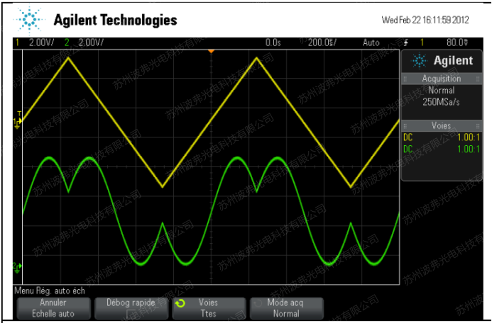 下圖中黃色的曲線是鋸齒波射頻的電信號(hào)(10Vpp)作用於電光強度調製器(qì)MX-LN-10調製器射頻接口上。綠色曲線是強度調整器輸出的(de)光強(qiáng),通過測量p相移所(suǒ)需的電(diàn)壓(yā),VpRF=4.8V@1540nm。使用不同頻(pín)率的射頻電信號,我們可以測(cè)得對應頻率下的VpRF。但(dàn)是(shì)這種測量方法(fǎ),並且隨(suí)著頻率的升高,所需的高頻設備也會(huì)變得非常昂貴。