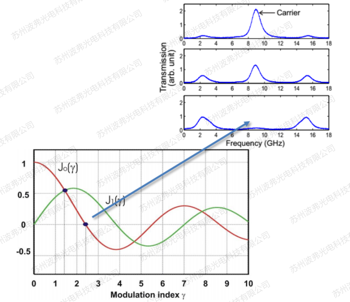 連續激光經過相位(wèi)調製器後,通過光(guāng)譜儀測量的(de)結果是載(zǎi)波和多階邊帶的頻率,其頻譜強度服從貝塞爾函數: