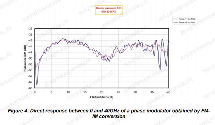 最終產生的強度調製的振幅(fú)取決於頻率f、濾波器的δf、先前校準過的驅動電壓以及(jí)要確定的調(diào)製器的頻率響應(yīng)。重要的一點是,必須工作在小信號模式以適應信(xìn)號Vo的振幅。調(diào)製器的電光響應S21必須用頻率f歸一化。頻率越高,精度越高(gāo)。在圖(tú)5所示的結果上,頻率響(xiǎng)應高於65MHz。