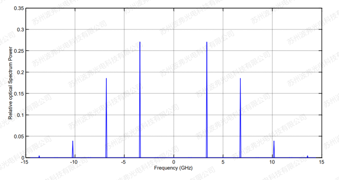 從(cóng)上圖(tú)可以看出(chū),當調(diào)製深度為2.4的時候,載波消失,請參考微信(xìn)文章“電光調製(zhì)器半波電壓(yā)隨頻(pín)率的變化(huà)”,CS-SSB情況下,下圖(tú)為相位調製(zhì)器(qì)輸出光譜的模擬計算結果,載波(bō)在”0”所處位置消失,±1階,±2階和±3階邊帶清晰(xī)可見,左右對稱分布。
