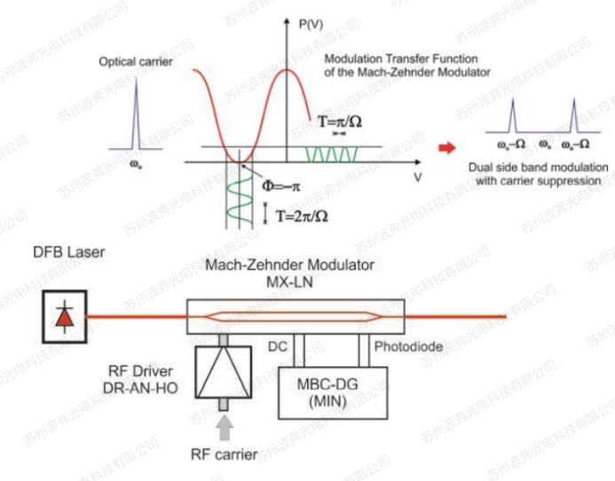 以上兩種(zhǒng)方式,如果僅需要單邊(biān)帶,均需要FBG過濾掉不(bú)希望的多階(jiē)光譜。而FBG多為定點頻率和帶寬,這無形中限製了這種方案在掃頻方麵(miàn)的應用(yòng)。而且,FBG一般較好的投(tóu)射(shè)/反射率<99%,僅僅相當於20dB的載波或邊帶抑製比,在一(yī)些特定應用中,希望得到更高的抑製比時這兩種方案就顯得無能為力(lì)了。為了解決上麵的(de)問題,一種新的(de)載波(bō)抑(yì)製-單邊帶調製方案就應運而生了。