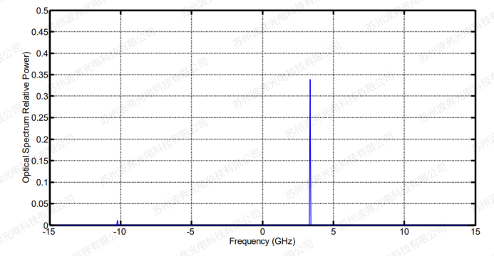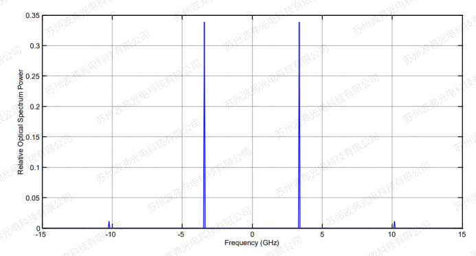 CS-SSB情(qíng)況下(xià),下圖為強度調製器在Min點時的輸出光譜的模(mó)擬計算結果,載(zǎi)波在”0”所(suǒ)處位置消失,±1階邊帶清晰可(kě)見,±3階邊帶少許(xǔ)出現。
