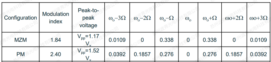 3. 強度調製器所產生的1階邊帶強度高於相位(wèi)調製器(見下(xià)表),因為相位調製器有部(bù)分強度分布在其他階邊帶上