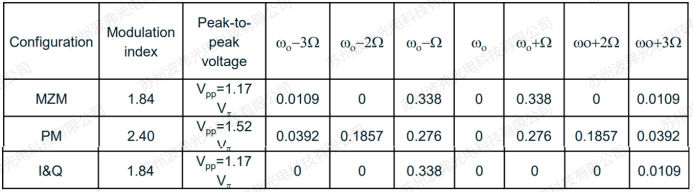強度(MZM),相位(PM),IQ(I&Q)調製器在載波抑製情況下,調製深度(Modulation index),調製(zhì)器驅動電壓(Peak-to-peak voltage),載波ω0, ±1階(ω0±Ω),±2階(ω0±2Ω)和±3階(ω0±3Ω)
