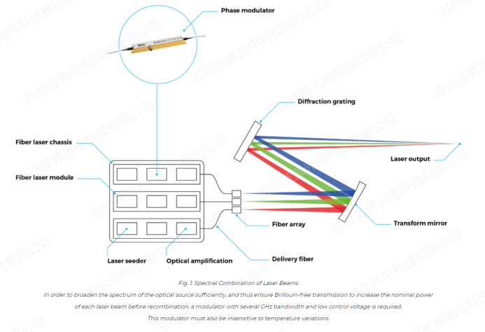 這些激光器中的每一路都通過電光相位調製器進行(háng)頻率調製,後者對(duì)於抑製光纖中的非線(xiàn)性布裏淵效應(也稱為受激布裏淵散射SBS)是尤為必(bì)要的。事實上,在光纖(xiān)中傳輸的過大功率會在玻璃結構中引發聲格振動。這種振動會導致(zhì)布拉格光柵效應限製(zhì)光的傳(chuán)輸:相當一部分光被(bèi)反射(shè),可能會損壞種子光源及其增益介質。抑(yì)製布裏淵效應的一個行之有效的方法是展寬(kuān)激(jī)光器的線寬(頻率調製)。通過(guò)鏈路中加入電光相位調製器,使這項技術成為(wéi)可能。因此,在光譜合成係統中,每個通(tōng)道的窄線寬激(jī)光器後麵都配備有一個或者多個相位(wèi)調製器。