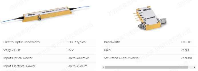 iXblue研製了NIR-MPX-LN-02及其配套(tào)的高壓射頻放大器DR-AN-10-HO,NIR-MPX-LN-02滿足SBC激光係統的所(suǒ)有要求,這種相位調製器具有(yǒu)超過5GHz的(de)帶寬,1.5V的極低半波電壓,超過33dBm的(de)射頻承受功率和300mw的光承受功率。