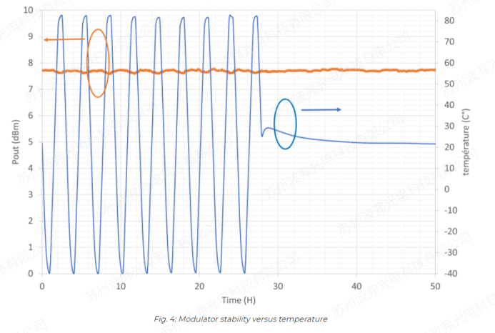 由於激光係統可能需要在戶外和具有挑戰性的環境中工作,因此對調製器(qì)進行了長時間溫(wēn)度循環測試。溫度(藍色曲線)從-40°C到+85°C,並記錄輸出功率(lǜ)(橙色曲(qǔ)線)。通過我們(men)的(de)特殊調製器工藝,調製器是非常穩定的,我們隻觀察到在整個(gè)溫(wēn)度範圍內0,2dB的微小變化。