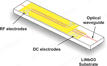 铌酸鋰(lǐ)的(de)晶體光學折射率被外(wài)部電場調製,外部電(diàn)場通過電壓施加在晶體的電極上,他(tā)們通常有兩個電極,調製電極(也稱RF電(diàn)極)和DC直流電極(也稱偏壓電極)。