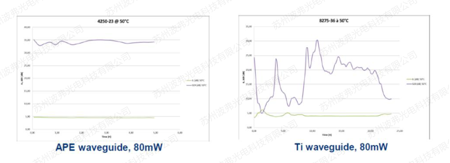 退火質子交換工藝相比鈦擴(kuò)散更難以(yǐ)實現。然後,這是為了實現調製(zhì)器在近紅外波段工作(zuò)的最佳技術(shù)。如下圖,退火質子交換工藝的(de)激光閾值要遠(yuǎn)遠高於鈦擴散工藝(yì)製(zhì)造出的調製器。當入射激光功率較高時,光折變效應出現時,波導(dǎo)的折射率隨時(shí)間變化,這將導致調製器不穩定,消光比的變差(chà)和光學損耗的增加。