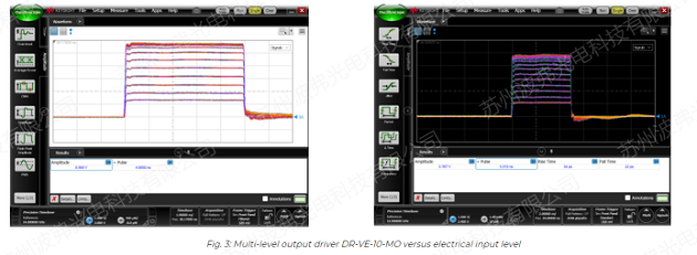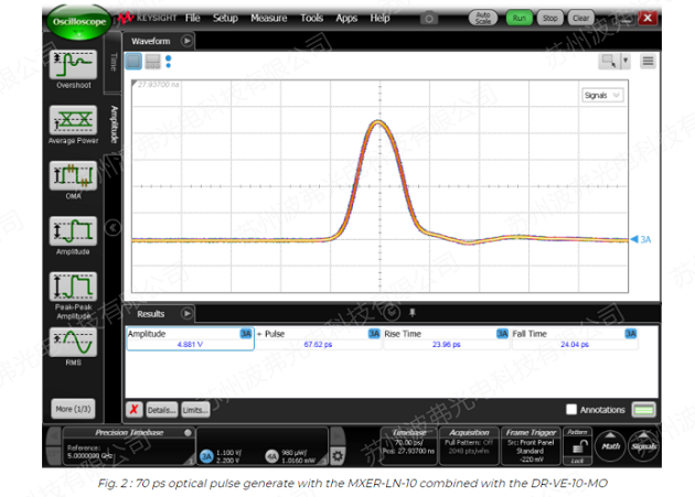 使(shǐ)用AWG,第一調(diào)製塊AM1用於產生超短光脈衝(chōng)。采用iXblueNIR-MX800、MXER1300和MXER高對比度寬帶幅度調製器,分別(bié)在850nm、1310nm和1550nm處獲(huò)得70ps的超短(duǎn)光(guāng)脈衝。調製器與(yǔ)驅動器DR-VE-10-MO相結合,DR-VE-10-MO可(kě)被設置為方形或高斯脈衝,限幅或線(xiàn)性放大器(qì)。采用iXblue偏(piān)壓控(kòng)製器MBC-DG-LAB,在高達數GHz的脈衝重頻下,獲得了較高(gāo)的(de)脈衝消光比穩定性。