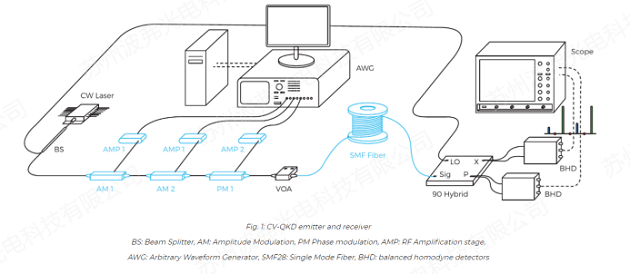 下圖給(gěi)出了(le)連續變量QKD(CVQKD)的一個實例。信息被編(biān)碼(mǎ)在激光脈衝的振幅(fú)和相位中,使用iXblue解決方案:兩個強度調製器AM1和(hé)AM2與相位調製器PM1級聯(lián)。