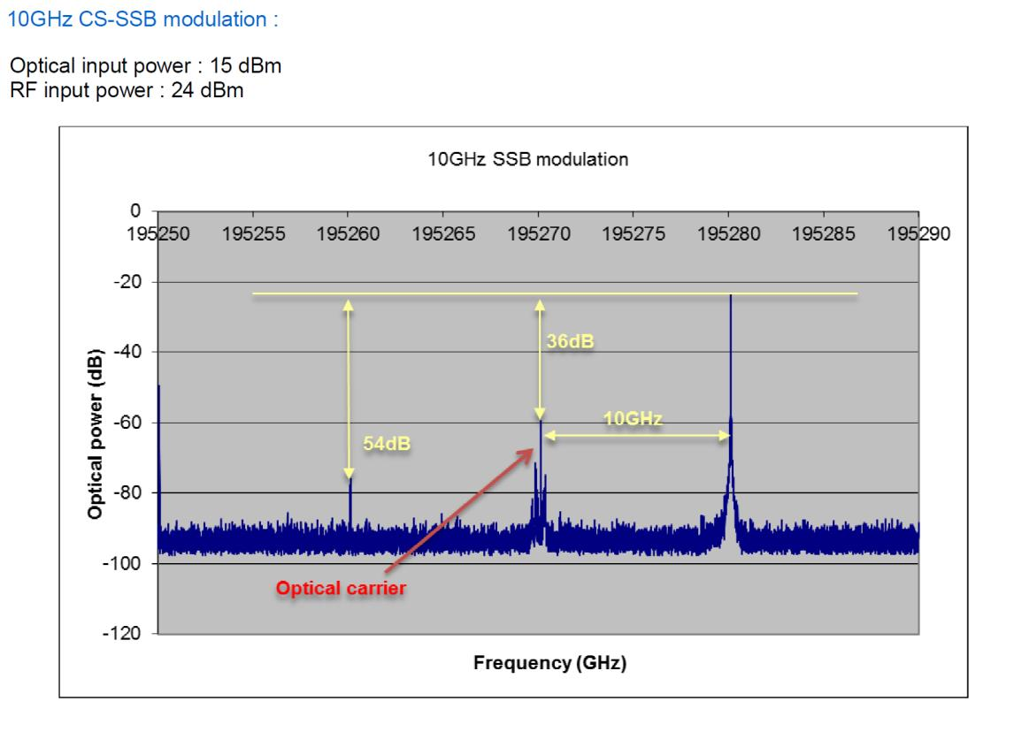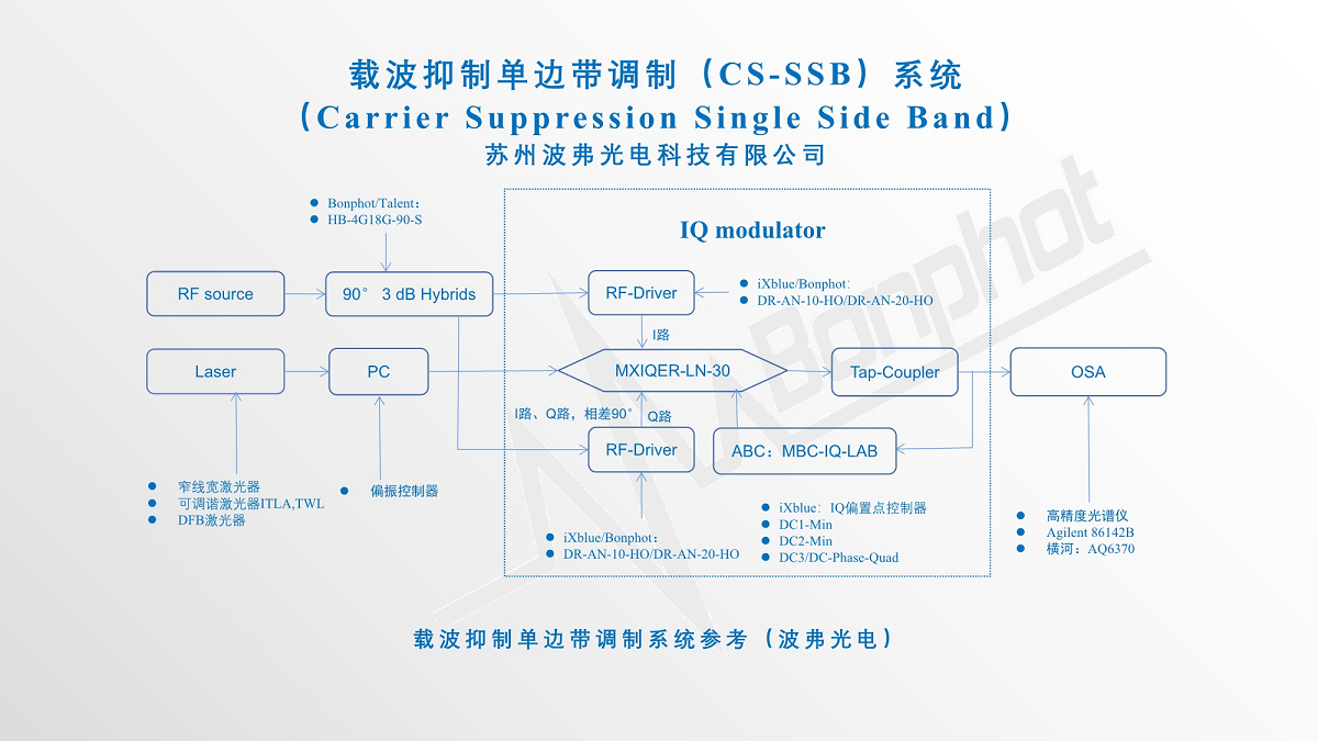 蘇州波(bō)弗光電科技有限公司提供完整的載波抑製單邊帶調製(Carrier Suppression Single Side Band)方案。基於法國iXblue高(gāo)消光(guāng)比、高抑製比(bǐ)、高載波衰減的高性能铌酸鋰IQ調(diào)製器(MXIQER-LN-30),提供高(gāo)達32dB載波衰減、邊帶衰減,是目前市麵上針對於單邊帶調製應用性能最好的調製器之一。