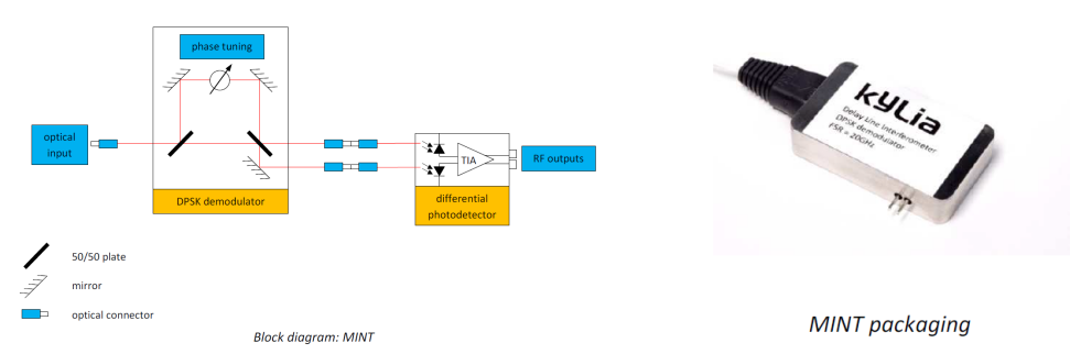 當對傳輸速率的需求高於Gbit/s時,必須開(kāi)發新的調製和解調技術。基於自由空間(jiān)設計和長期的電信技術背景,iXblue能(néng)夠為(wéi)這種複雜的解調提供各種產品。其中一係列(liè)產品(iXblue MICS係列,請(qǐng)聯係我們提供更多資料)致力於多路複用和(hé)解複用,這意味著(zhe)能夠在一根獨特的光纖中傳輸許多不(bú)同波長的激光(即40路不同波長的激光束(shù)在(zài)一根(gēn)典型的電信光纖中傳輸,1528至1560 nm,C波段,)。另一係列產品(iXblue MINT係列,見下圖)使(shǐ)用光的另一個(gè)特性進行解(jiě)調,即(jí)電磁波的相位,相位(0或π)的調製比強度的(de)調製更容易、更快。MINT產品(pǐn)使光學DPSK(差分相移鍵控)解調成(chéng)為可能,它適用於(yú)大約10 Gbit/s的更高傳輸速率。i