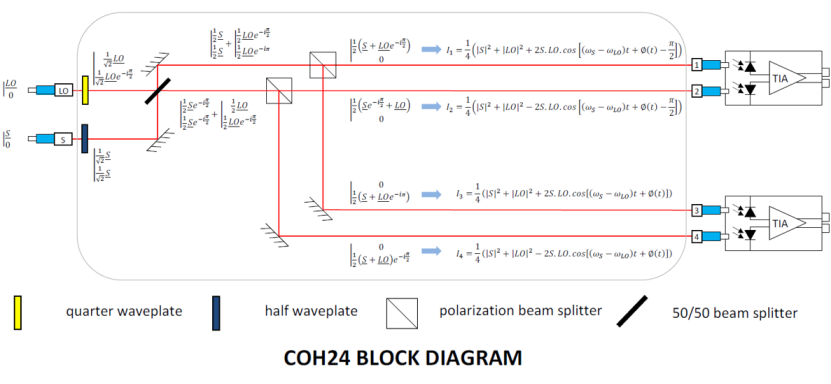 隨(suí)後產生了(le)“QAM”技術,這是一種使用電磁波相(xiàng)位和強度的調製技術。除了前麵(miàn)的優點之外(wài),該解決方案允(yǔn)許使用中間值(zhí)(0和1之(zhī)間,0和π之間(jiān))進行調製。它為信息編碼提供了更多的可能性。例如,QAM16和QAM64技術可以在單位比特時間內處(chù)理4到6比特。這種信號的解調非常(cháng)複雜(zá),可以通過iXblue 90°光學混頻方案(iXblue COH係列,見下圖)實現(xiàn)。信號光(guāng)的(de)相位、振幅甚至偏振態,通過信號光和本振光(特定頻率的參考光)之間執行四次90°相位幹(gàn)涉。