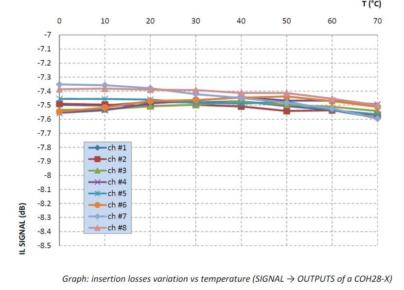 感謝最初為電信行業開發(fā)的環氧樹脂技術,iXblue器件可以提供穩定、堅固的特性。下圖為COH光混頻器(qì)優異的(de)溫度(dù)性能,插損隨溫度的變化極(jí)小,滿足苛刻環境(jìng)下的應用要求(qiú)。