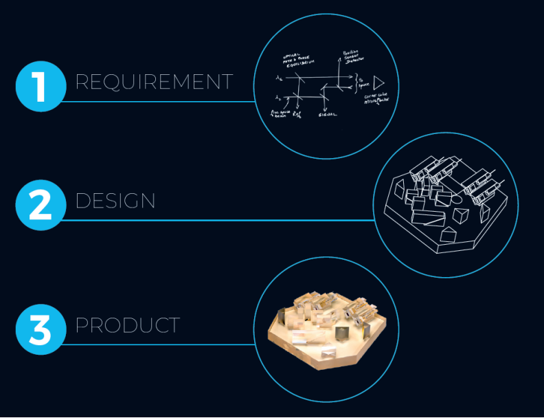 iXblue能(néng)夠將實驗裝置集成為工業級的光(guāng)學模塊,從客戶要求(簡易的(de)草圖,下圖步驟1)開(kāi)始,iXblue可(kě)以領(lǐng)導或參與完整的產品開發(fā)步驟:設計(下圖步驟2)、原型機到批量生(shēng)產(下圖步驟(zhòu)3),iXblue的(de)專業技術在於將微光(guāng)學元件超精確地組裝在玻璃基板(bǎn)上,在滿足光學性能要求的前提下提供更小的體積,優異的可靠性和穩定(dìng)性。