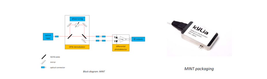 當對傳輸速率的需求高於Gbit/s時,必(bì)須開發(fā)新的調製和解調技(jì)術。基於自由空間設計和長期的電信技術背景,iXblue能夠為這(zhè)種複雜的解調提供各種(zhǒng)產品。其中一係列產品(iXblue MICS係列(超鏈接(jiē)),請聯係我們(men)提供更多資(zī)料)致力於多路複用和解複用,這意味著(zhe)能夠在一根獨特(tè)的光纖中(zhōng)傳輸許(xǔ)多不同波長的激光(即40路不同(tóng)波(bō)長的激光束在一根典型的電信光纖中傳輸,1528至1560 nm,C波段,)。另一係列產品(iXblue MINT係列,見下(xià)圖)使用光的另(lìng)一個特性進行(háng)解調,即電(diàn)磁波的相位,相位(0或π)的調製比強度的調製更容易、更快。MINT產品(pǐn)使光學DPSK(差分相移鍵控)解調成為可能,它適用(yòng)於大約10 Gbit/s的更(gèng)高傳輸速率。(MINT:延遲線幹涉(shè)儀,DPSK解調器)