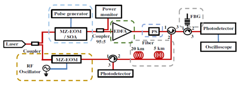 如下(xià)圖,窄線寬激光器通過高消光比強度調(diào)製器(>40dB,係(xì)統可實現100dB高消光比(bǐ)),帶(dài)寬~10.8GHz,經過脈衝調製,經過EDFA放大後,通(tōng)過擾偏器消除偏振影響,再通過環形器實現遠距(jù)離傳輸,和經過FBG濾波後,通過光電探測器(qì)解調和(hé)檢波。