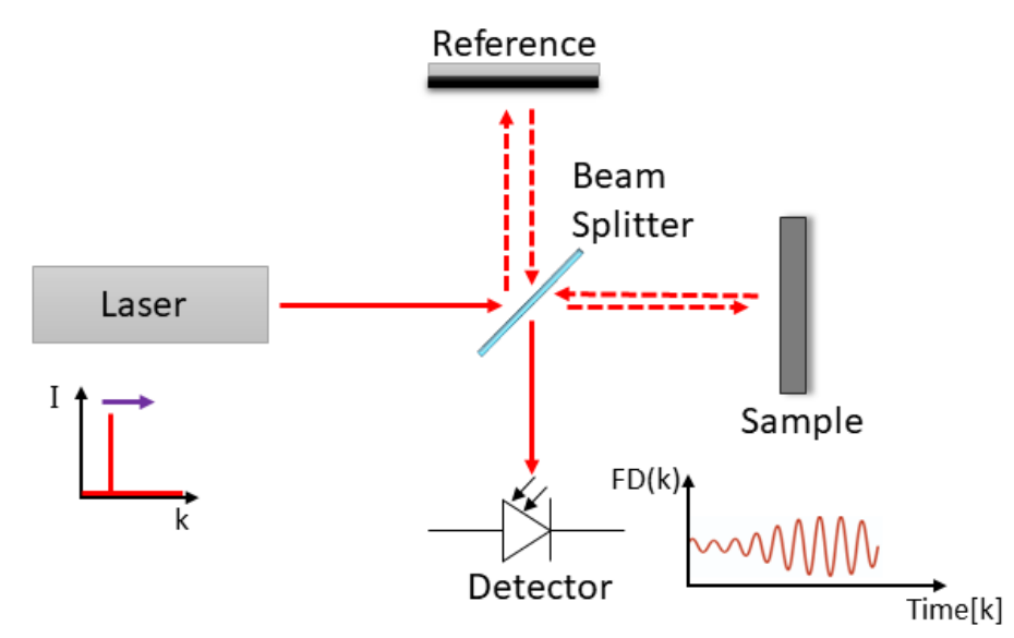 圖1:相幹探測(cè)示意圖:波長可調激光器被分割(gē)為參考,再次(cì)組合(hé)的樣本/場景及其與光電探測器的檢測,由數字(zì)化儀和快速傅立葉變(biàn)換獲取,得出距離(+速度)