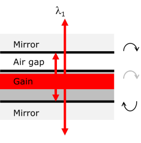 圖2:帶襯底反射鏡、增益區、氣隙和頂部反射鏡的MEMS-VCSEL示意圖。