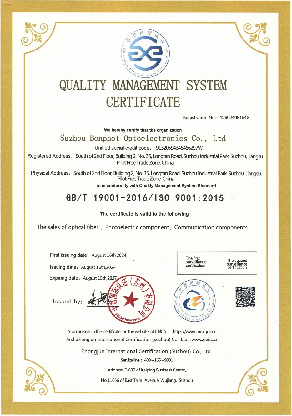 蘇州波弗(fú)光電科技(jì)有限公司 GB/T 19001-2016/ISO 9001:2015質量管理體係認證(zhèng) 證書