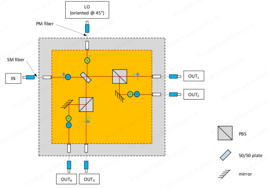 對於單偏(piān)振光混頻器(COH24和COH24-X),信號和本振光都有保(bǎo)偏光纖(PMF),輸出為單模光纖(SMF)。